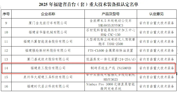 最近、福建省工業情報化局は「2025年福建省認定主要技術設備(初セット)リスト」を発表した。福建省泉公機械有限公司が独自に開発したレンガ製造ラインシステム「ZN1500YD」が見事に選定され、省レベルの「主要技術設備(一式)」として認められました。この認識は完全に示していますクアンゴン機械株式会社コンクリート製品製造装置分野における技術革新力と独自の研究開発能力。これは、ハイエンドのインテリジェントレンガ製造機械の分野における同社の新たなマイルストーンでもあります。